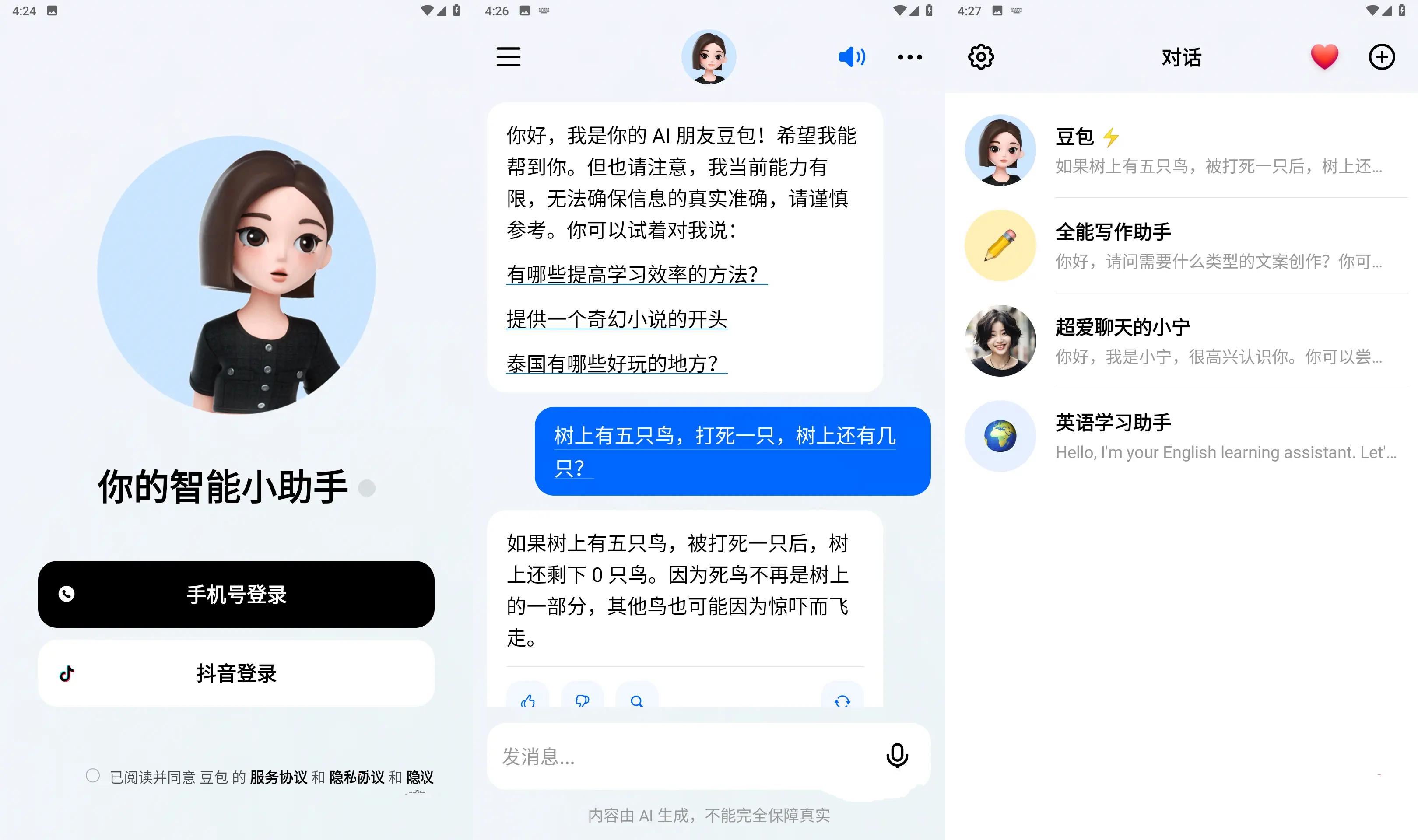 软件介绍 直接登录就可以使用,豆包是字节跳动出品的一个人工智能聊天机器人,可以写作,可以翻译,可以聊天等等,大家自己测试吧。 豆包是字节跳动最新推出的免费AI对话工具,提供网页端、iO...