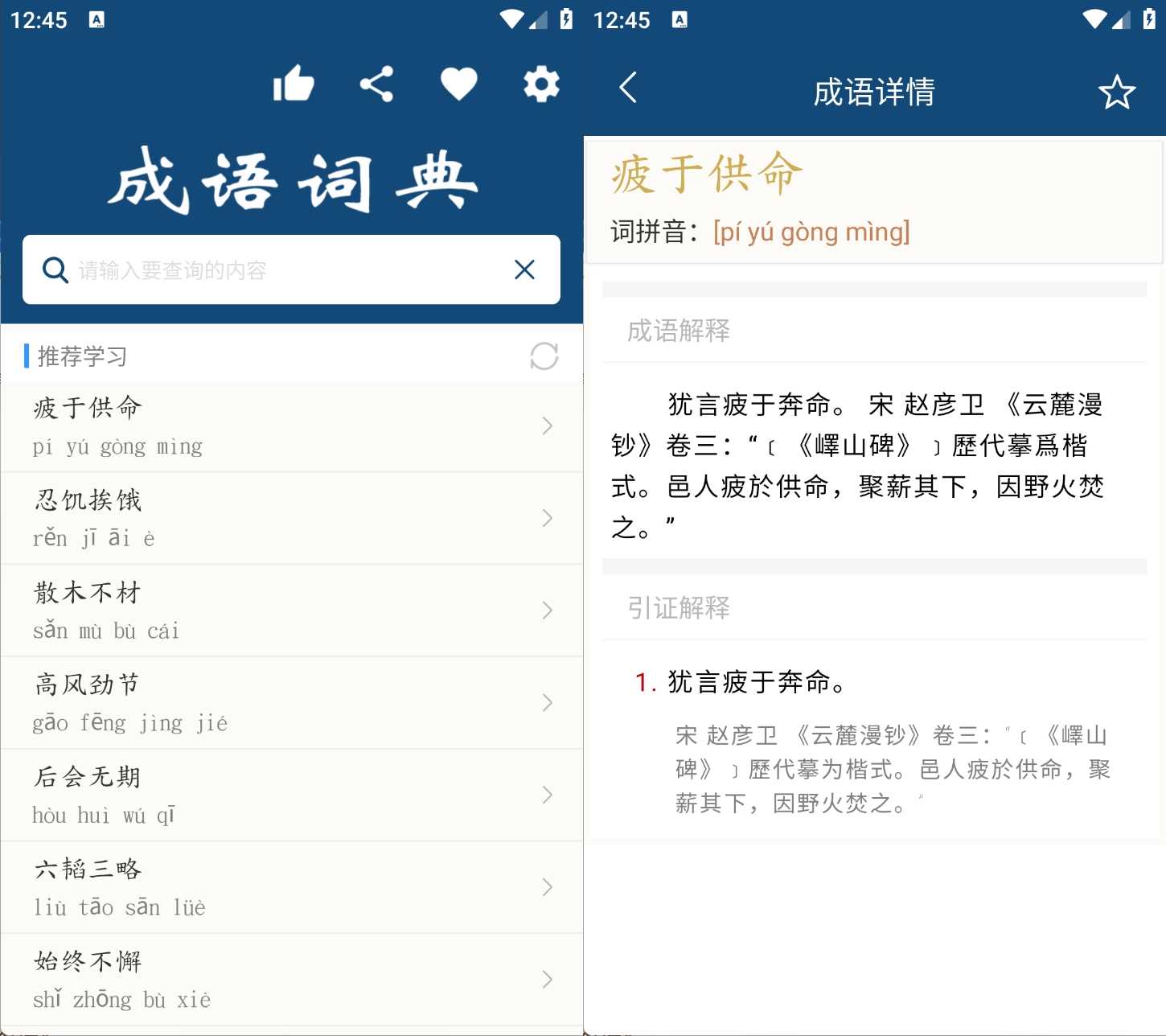 成语词典:离线查询与学习工具 - 收录超5万条成语及故事 本应用是一款功能完备的离线成语词典,收录了超过五万条成语词条。每条成语均提供详细释义、出处、用法实例等解释内容,并包...