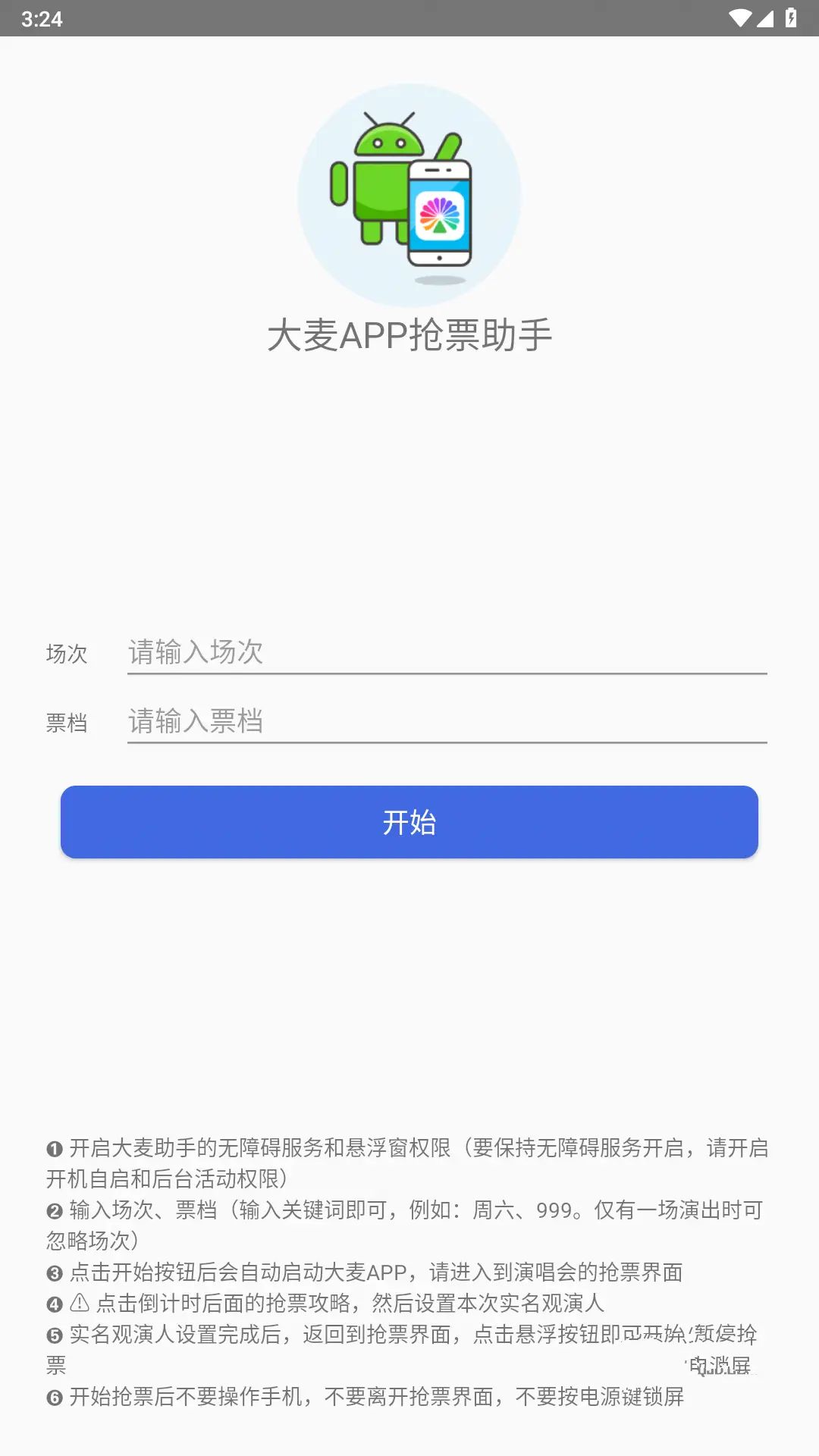 软件介绍 大麦助手app,抢购大麦的自动化脚本,免卡密激活。 大麦助手是专为大麦APP设计的抢票软件。用户下载后无需卡密或激活码即可立即使用。只需按照简单的提示进行操作,所...