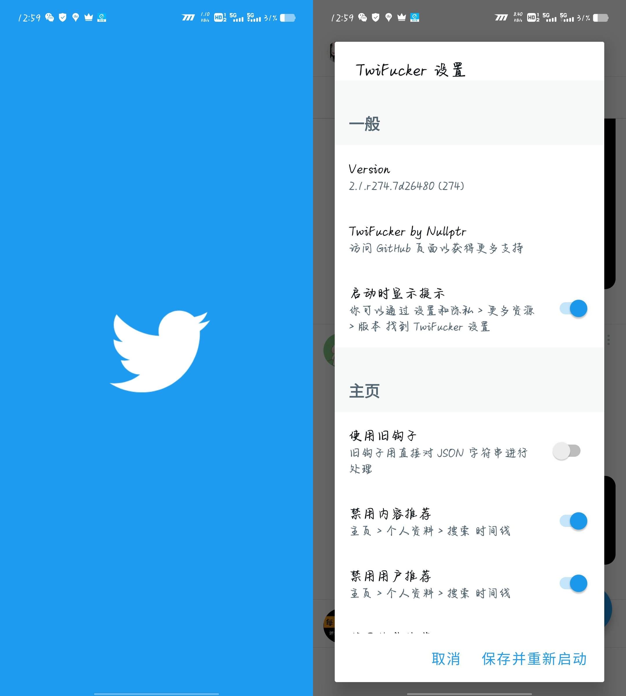 内置TwiFucker模块 删除推广内容、趋势、用户和敏感媒体警告 可复制的替代文字和隐藏抽屉项目 禁用推荐用户 下载媒体菜单 禁用推文详细信息...