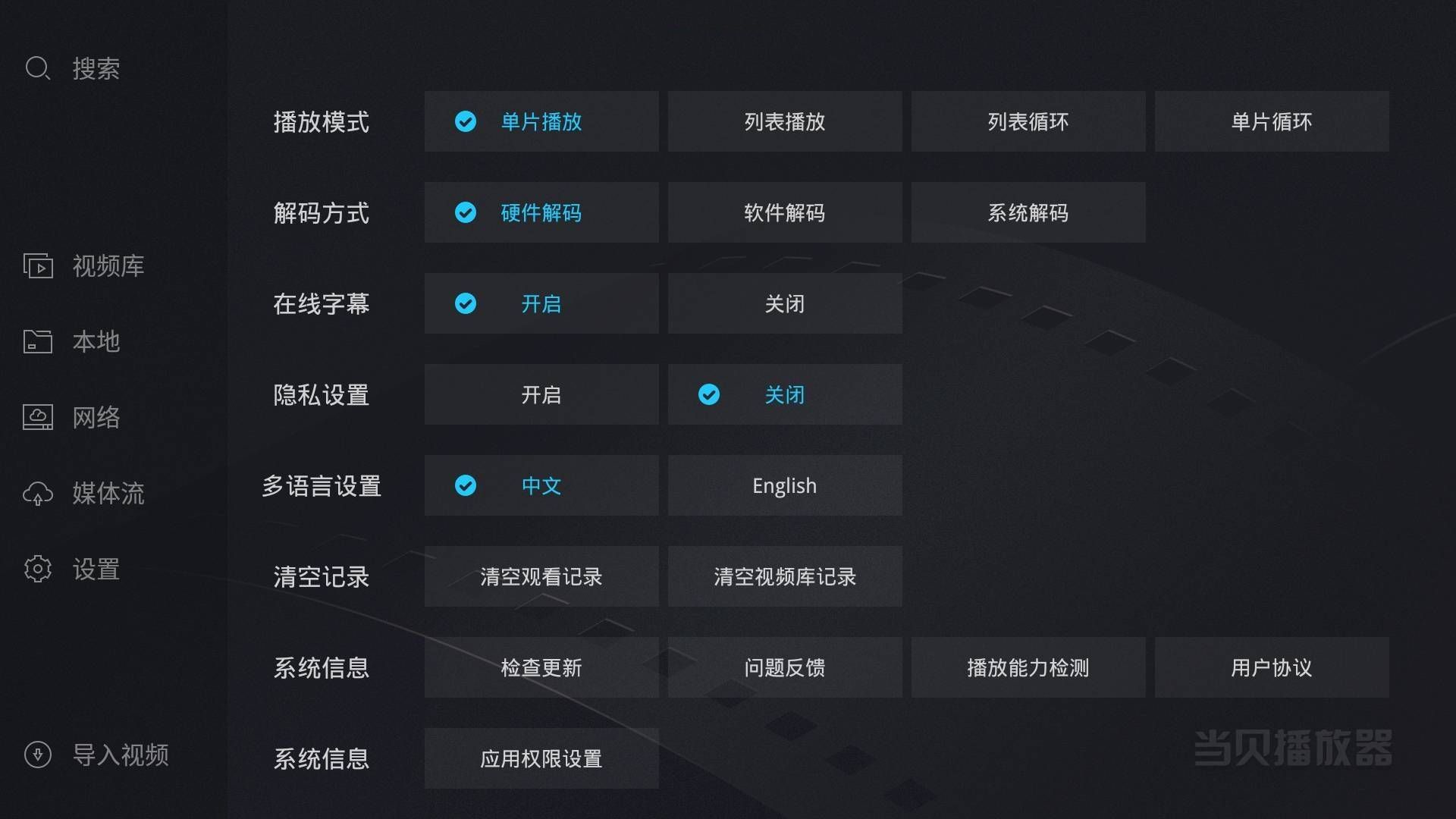 当贝播放器tv版是一款拥有极简播放风格方式的视频流播放工具软件,专业为智能电视,盒子投影等,专业打造,炫酷的界面设计,外部设备导入视频后,它可以自动匹配电影海报封面,内容介绍和剧照。操作简单,可个性化设置。软件特色